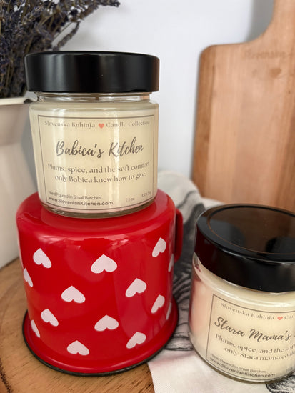 Step into a Slovenian grandmother’s kitchen with the Stara Mama’s Kitchen | Babica's Kitchen candle, evoking the comforting scents of ripe plums, warm spices, and the soft, nurturing atmosphere only a grandmother could create.