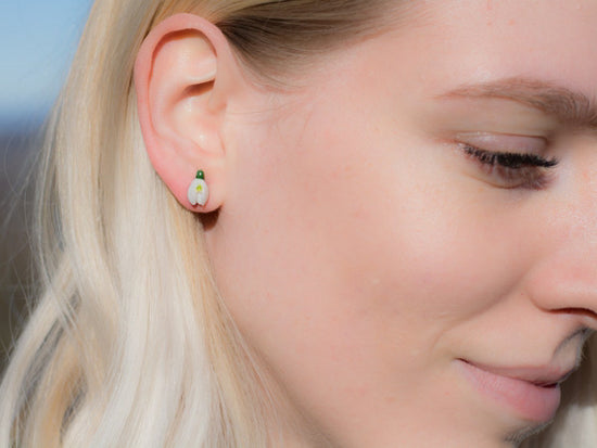These adorable miniature snow drop white flower earrings are sculpted by hand using polymer clay. Making them an exquisite, one of a kind collection.